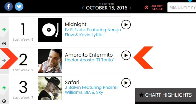 Acosta se coloca con esta bachata -escrita por Romeo Santos- en la segunda posición, lo que muestra el gran crecimiento en difusión y popularidad del tema, tanto internacionalmente como en el plano local.