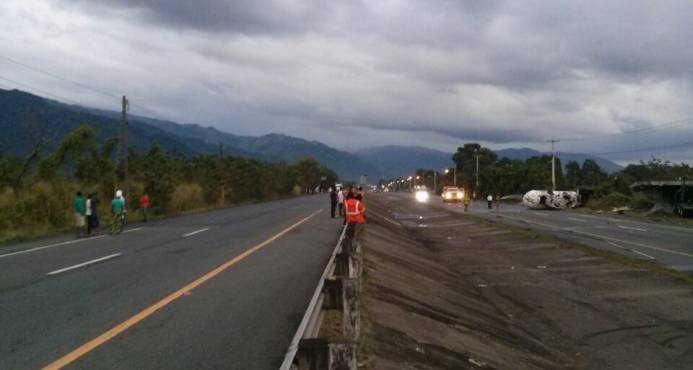 El tránsito se mantiene desviado en dirección Santo Domingo- Santiago, a la altura del kilómetro 90 de la autopista después de la Plaza Jacaranda, en el tramo Bonao-La Vega, debido a que uno de los camiones involucrados en el accidente se encuentra atravesado en la vía.