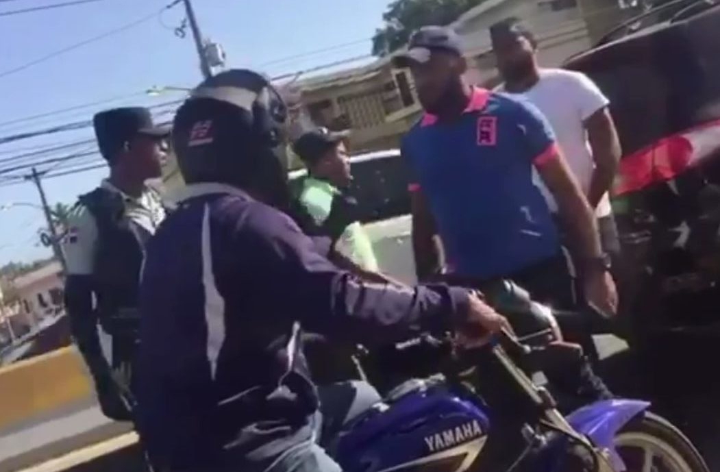 En un video que circula en las redes sociales dos agentes de la Digesett le quitan la llave de una motocicleta a un hombre que al parecer cometió una infracción, pero en medio de la discusión llegan tres hombres se desmontan de yipeta Hyundai, color rojo vino y obligan bajo amenaza con armas automáticas de alto calibre a los agentes de la Digesett a devolverle la llave.