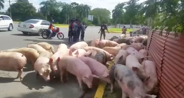 Cientos de cerdos quedaron esparcidos por la avenida Pedro Rivera de La Vega, cuando una patana donde eran transportados los animales se volcó.