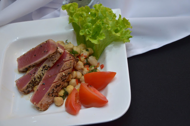 –Atún Salad, preparado con atún marinado en salsa de soya con garbanzos (670 Kcal, proteínas 37.29 g, grasas 31.79 g y carbohidratos 51.5 g.